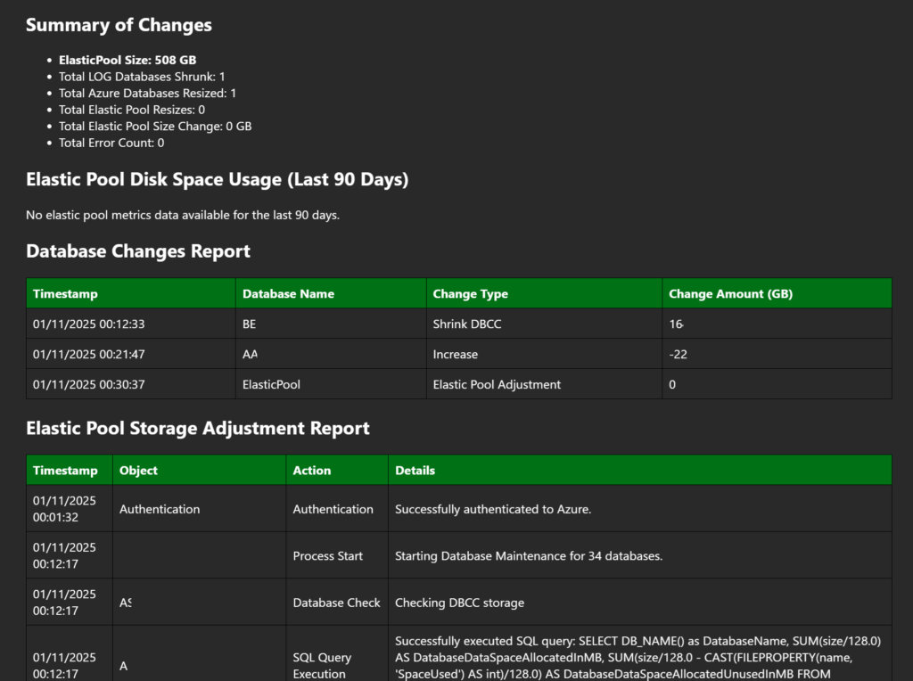 - Reporting: After performing these maintenance tasks, the script compiles a comprehensive report detailing the changes made, including database shrinks, resizes, and elastic pool adjustments. This report is then sent via email to the designated recipients, providing a complete audit trail of all actions taken.